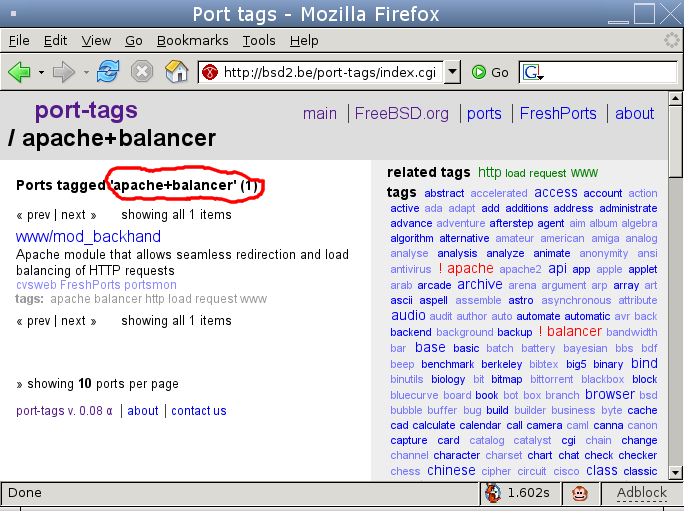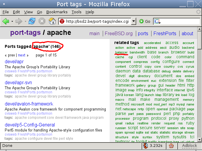 Let's supposed that we are interested in all apache-related FreeBSD ports that are also somehow related to load-balancing (I also highlighted the balancer tag in the previous screenshot). When we click on it, we get:
